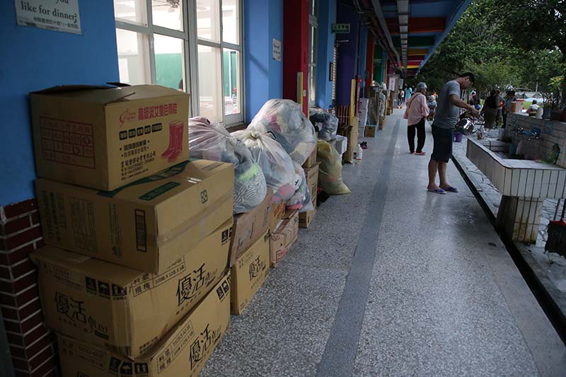 兩個小時後終於抵達收容所,停好車後,迅速將兩張氣墊床送至學校二樓,學校穿堂擺滿各種紙箱與物資,每間教室宛若一個臨時小聚落,大家在教室、走道做著平常在家裡做的事情,長輩在洗手台洗頭髮、在走廊使用吹風機、或是用瓦斯爐烹煮熱水泡茶等等,稍微緩解風災裡的緊張氣氛。走進閱讀教室,原本的書香味現在已充滿受潮的褥濕氣息,教室不大,書櫃也已撤至牆邊,中間就是臨時的躺床,十多位長輩或睡或臥正休息著。