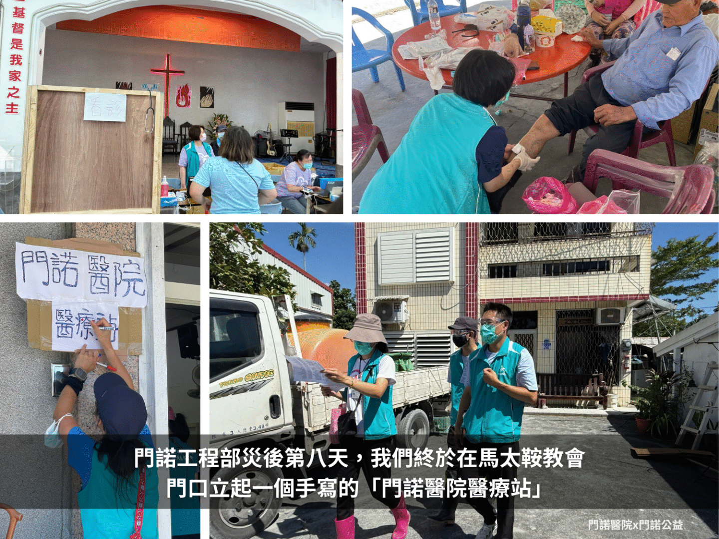 災後第八天,我們終於在馬太鞍教會門口立起一個手寫的「門諾醫院醫療站」標示。雖然這個標示並不完整,但它象徵著門諾的服務精神。長照也隨醫療站進入服務長者的需要,團隊接力撐起整體的救災服務。
